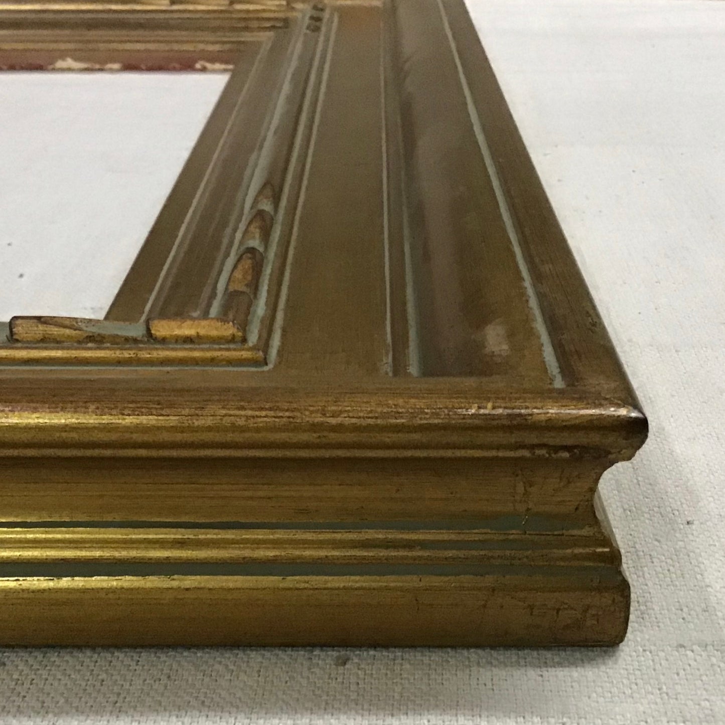 4.5 in. wide profile with large quarter round outer cap, flat panel, and raised linear bead with hand carved accents in corners. Finish is gold.