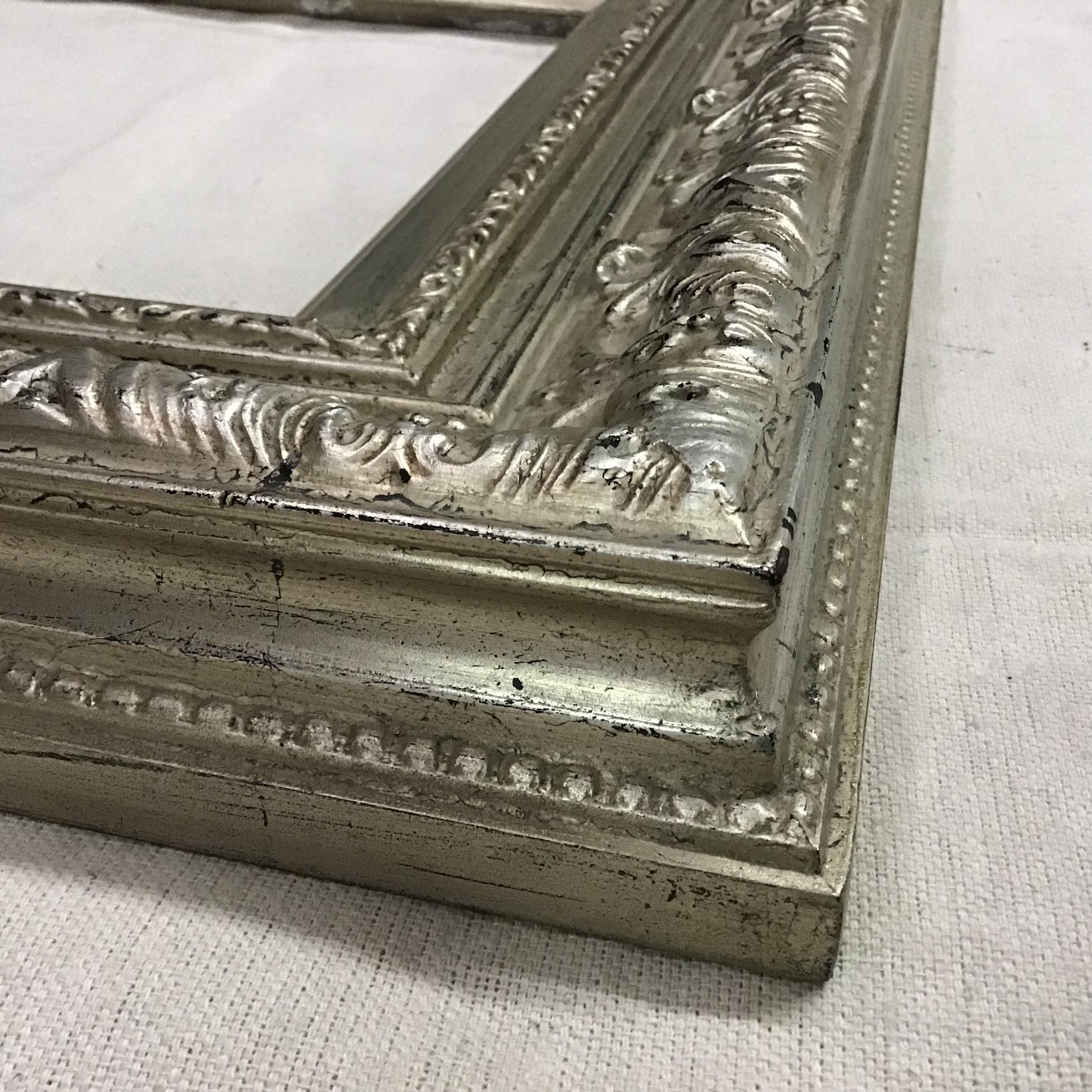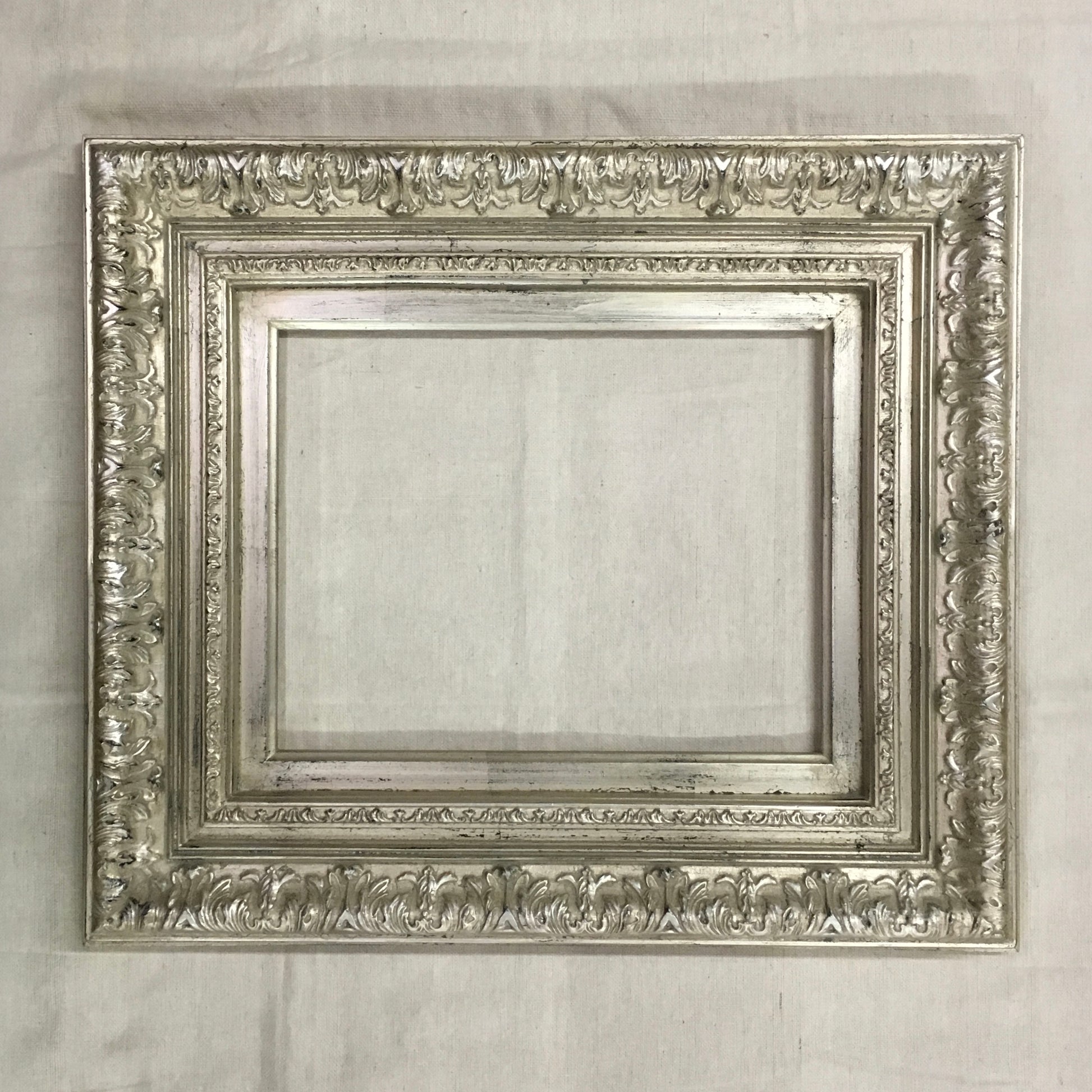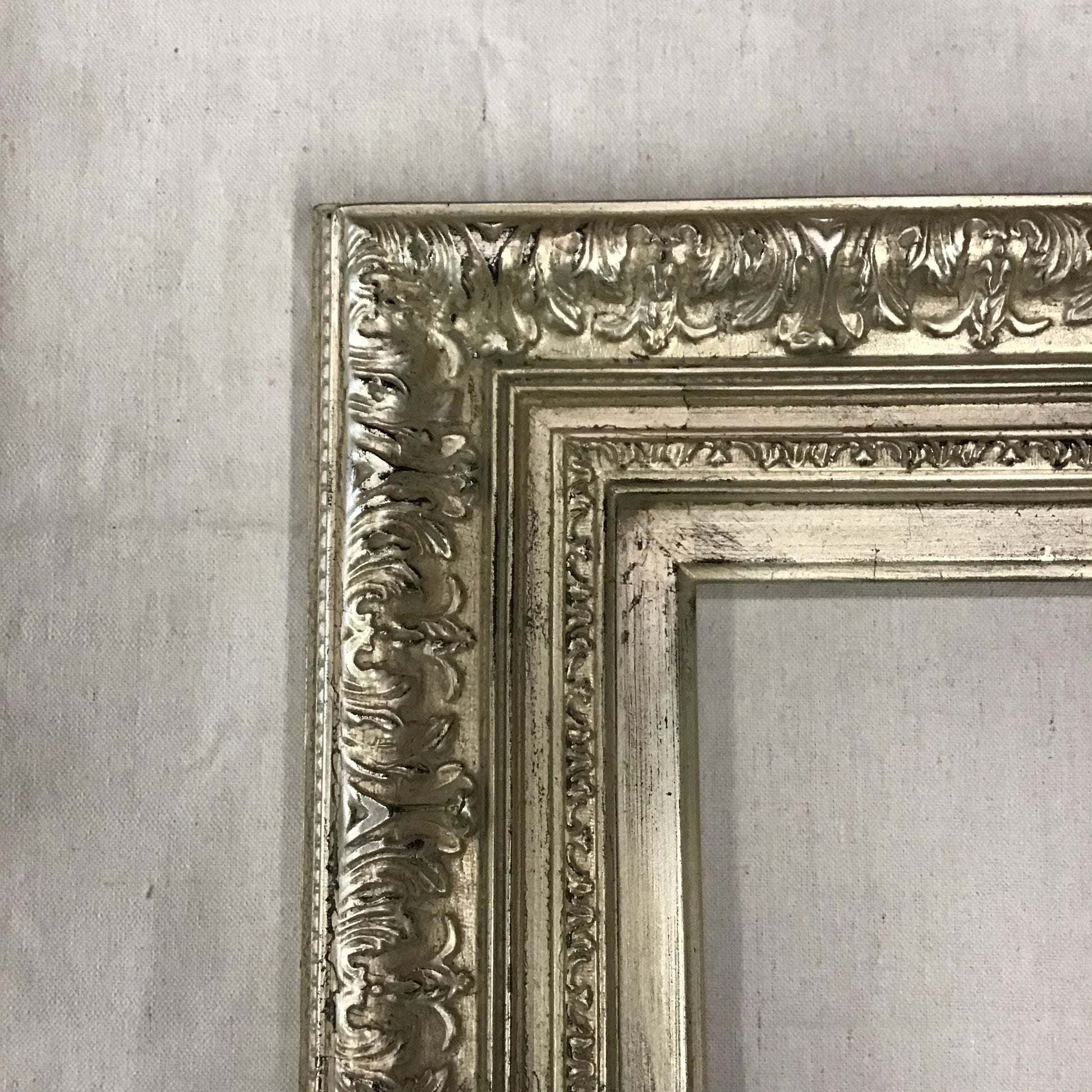 4.5 in. wide ogee scoop profile with very busy rococo pattern. Finish is aged silver.