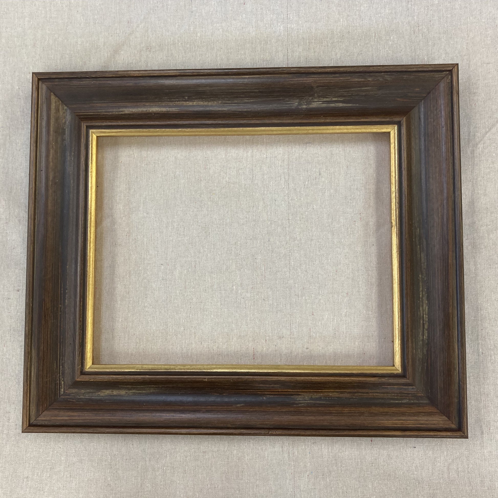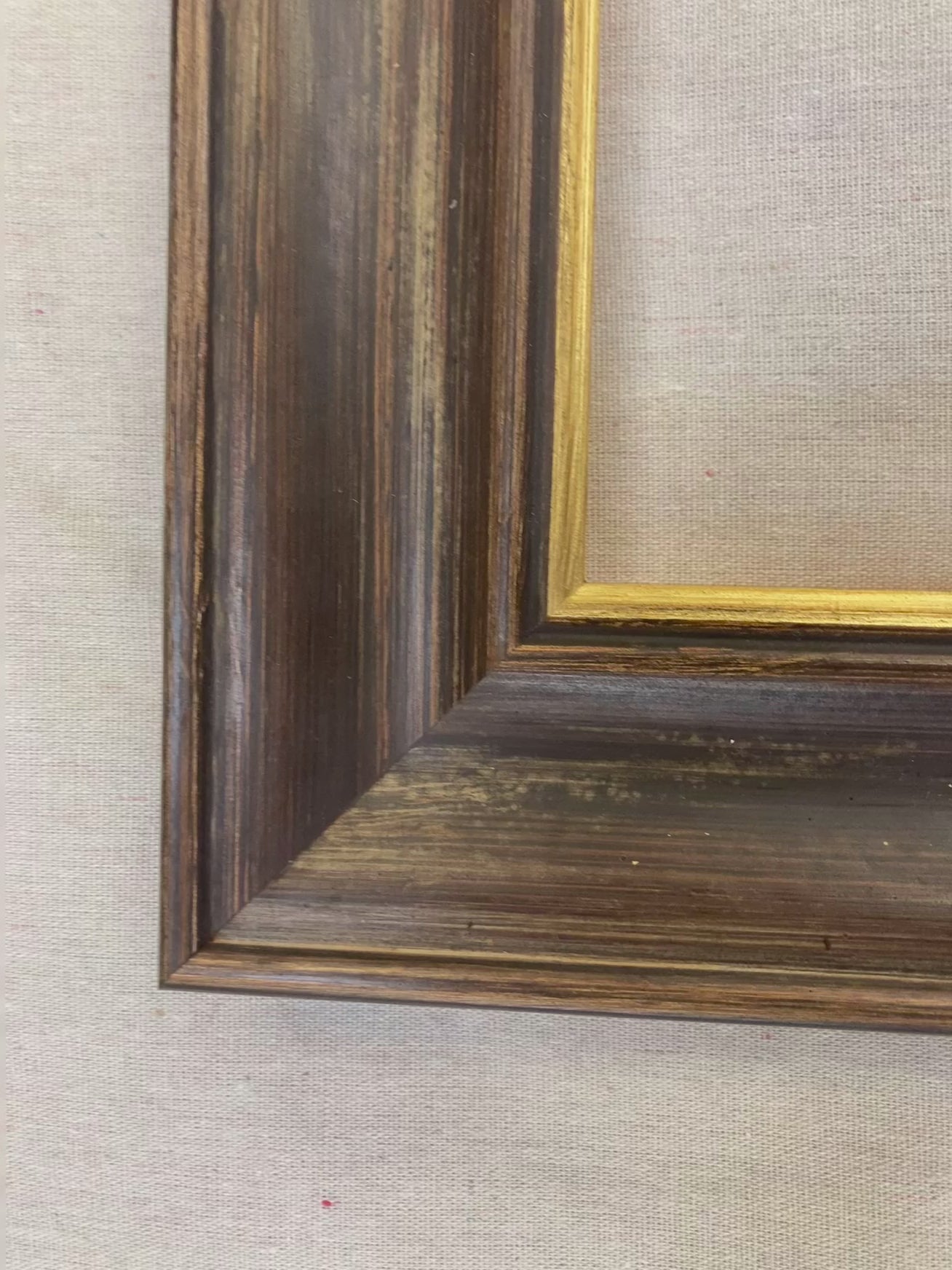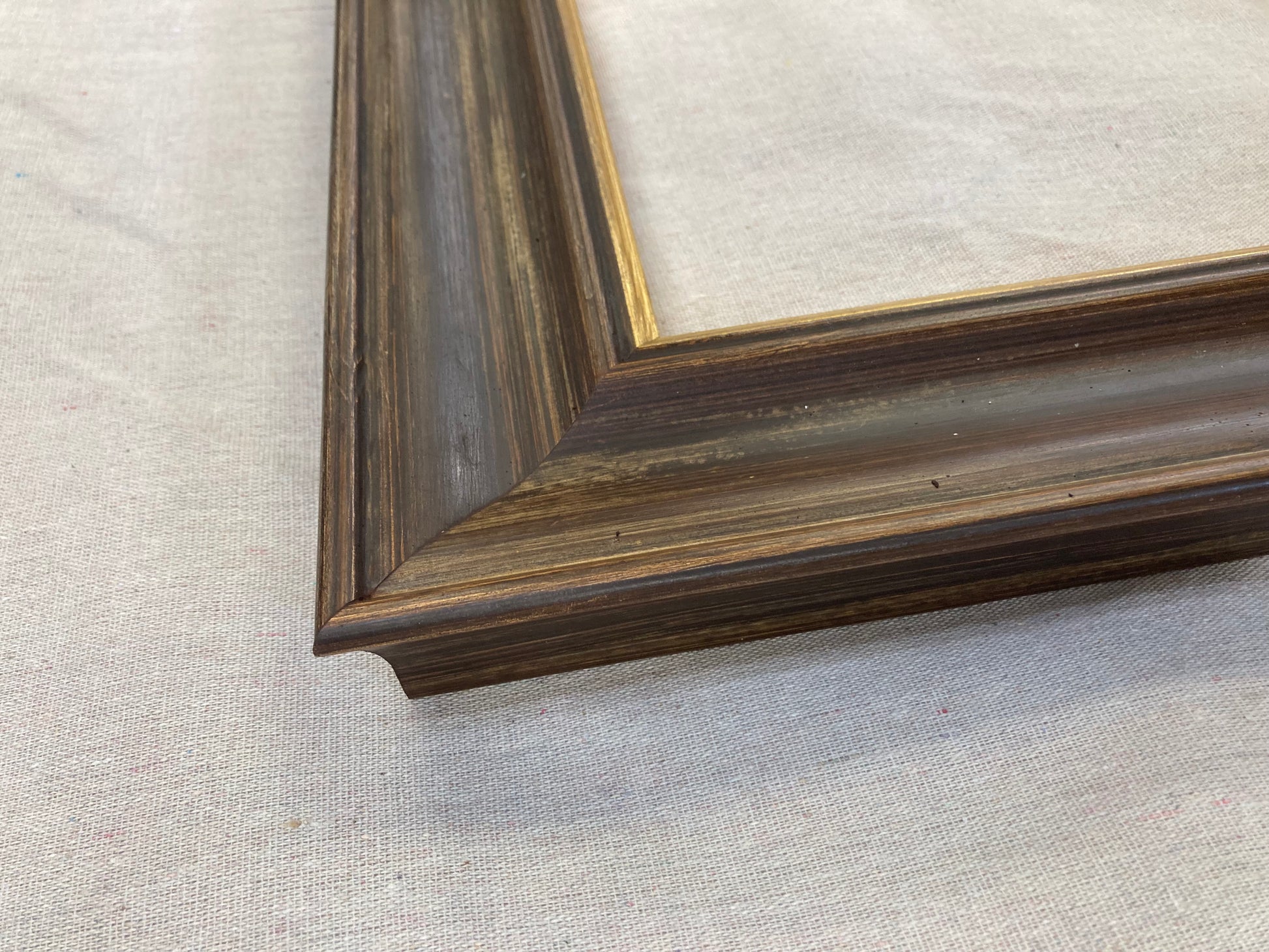 3 inch wide ogee scoop. Finish is brown faux wood with a gold lip. Rabbet is 15/16" deep.